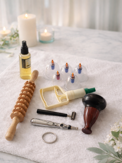 오일 또는 허브 제품과 함께 괄사 도구를 사용하여 피부 표면을 자극하고 마사지와 병행하는 방법입니다.